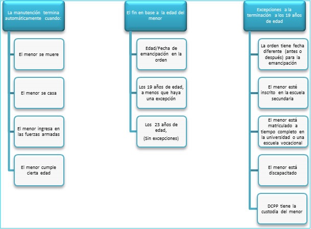 Esta ley no va a cambiar los términos de la orden de manutención que tiene. Si su orden de manutención indica ya sea la fecha exacta en que el niño será considerado emancipado, como el 22º cumpleaños del hijo, o un evento que causará que se le considere emancipado, como cuando este se gradúa de la universidad, esta fecha será considerada como la fecha de la finalización del pago de la manutención. Si la oficina de libertad condicional recoge y procesa el pago de la manutención para menores, dicha fecha (o fecha esperada) se tendrá como la fecha de finalización.