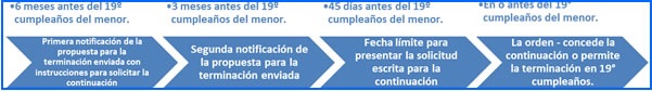 La solicitud escrita para que se continúe el pago deberá ser recibida en la dirección indicada por lo menos 45 días antes que el menor cumpla los 19 años de edad. Para determinar el plazo de los 45 días, cuente todos los días, incluyendo los fines de semana y feriados.