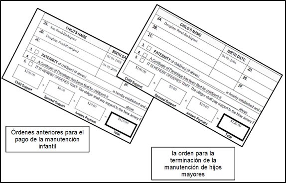 Ejemplo: El Sr. Patel-Rodriguez le paga a su ex esposa, la Sra. Patel-Rodriguez, 100 dólares semanales para cubrir el apoyo actual y 20 semanales para cubrir los pagos atrasados, totalizando 120 dólares semanales. Cuando su hijo cumpla 19 años, y no haya una excepción que aplique, la manutención para su hijo se terminará. La orden jurídica determinará la fecha del cumpleaños número 19 del hijo como la fecha para el cese de la manutención. La orden judicial también indicará que la cuantía del pago para la manutención del menor restante, de ahora en adelante, será de 100 dólares semanales para cubrir la obligación actual y 20 para cubrir los pagos atrasados, totalizando120 dólares semanales. Esto es una cantidad mayor lo que las directrices para la manutención infantil en Nueva Jersey indican en el caso de un solo hijo, y la finalización de la obligación es un cambio sustancial en las circunstancias. Por lo cual , el Sr. Patel-Rodriguez tendrá que presentar un pedimento o una solicitud para pedir que se rebaje el monto de dicho sustento de acuerdo a las directrices.