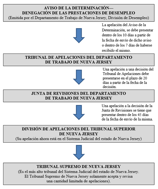 Las apelaciones de las decisiones del Tribunal de Apelaciones son presentadas ante la Junta de Revisiones. Al igual que el Tribunal de Apelaciones, dicha Junta es una entidad dentro del Departamento de Trabajo (NJDOL), que revisa las apelaciones en casos de desempleo. Sin embargo, a diferencia del Tribunal de Apelaciones, la Junta de Revisiones generalmente solo analiza las apelaciones que están en el expediente (el testimonio y las pruebas presentadas en la audiencia ante el Tribunal de Apelaciones). La Junta examina los argumentos escritos hechos por cada una de las partes y generalmente emite una decisión por escrito, sin llevar a cabo ninguna audiencia adicional. La Junta puede estar de acuerdo, revocar o modificar las decisiones del Tribunal de Apelaciones. También puede devolver el asunto al Tribunal de Apelaciones para una audiencia adicional, si existen preguntas que se deben contestar antes de poder tomar una decisión.