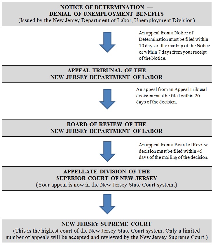 If you wish to file an appeal to the Appellate Division, you must file a “Notice of Appeal” within 45 days of the mailing date of the Board of Review’s decision. The Notice of Appeal is a specific form that you must fill out and mail to the Appellate Division, along with a copy of the Board of Review’s decision. You must also send a copy of the Notice of Appeal to your former employer as well as the NJ Attorney General’s office. For Notice of Appeal and instructions, see the NJ Judiciary’s Board of Review Pro Se Kit. As always, read the instructions carefully. If you do not follow the instructions properly, you risk having your appeal dismissed without the Court making a decision on whether or not the Board’s decision was correct. Always keep a copy of everything you submit to or receive from the court.