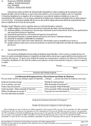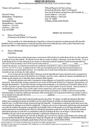 Aviso: a menos que el dueño y el inquilino pacten por escrito un plazo más largo, el propietario tiene que pedir al secretario del tribunal que dicte una orden de desalojo dentro de los 30 días de haber recibido el fallo. Si el dueño espera más de 30 días, este le deberá notificar al inquilino y regresar al tribunal para obtener el permiso para pedir la emisión de la orden. Vea NJ Court Rule 6:7-1(d).